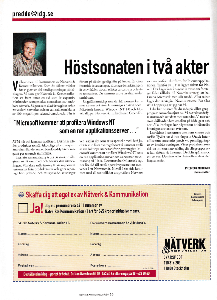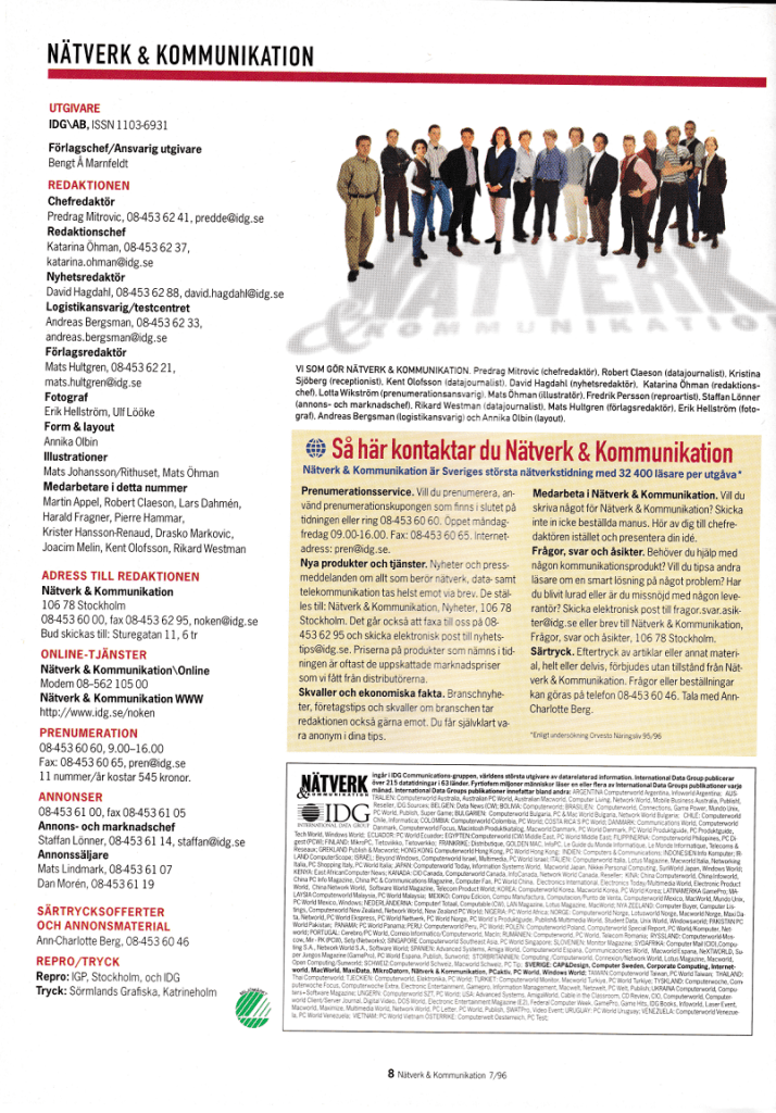 Här bjuder jag på ett exempel från 1996. Det är tidningen Nätverk & Kommunikation där min skribentkarriär började tidigt 90-tal. Fick förmånen att vara frilansande medarbetare för dåvarande chefredaktören Bertil Myhr. 1995 började jag jobba på IDG \Sweden som testredaktör för samma tidning. Nedanstående nummer är det första numret där jag är chefredaktör för tidningen. En nostalgitripp drygt 28 år i tiden.
