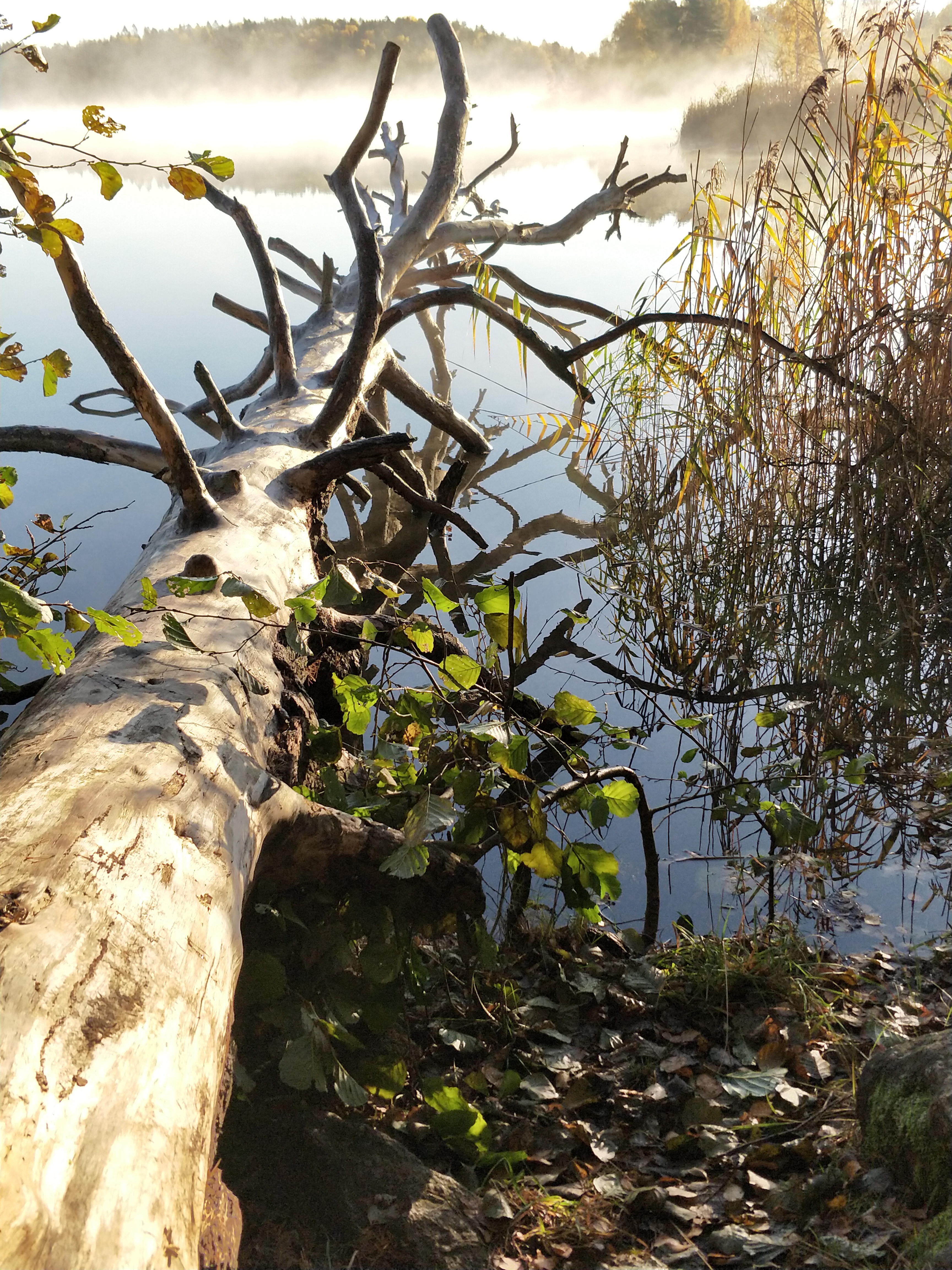 October 19th 2017 in the southern part of Stockholm at the lake Trehörningen. Morning mist over the lake, a fallen tree and reflections on the surface tickle ones imagination.